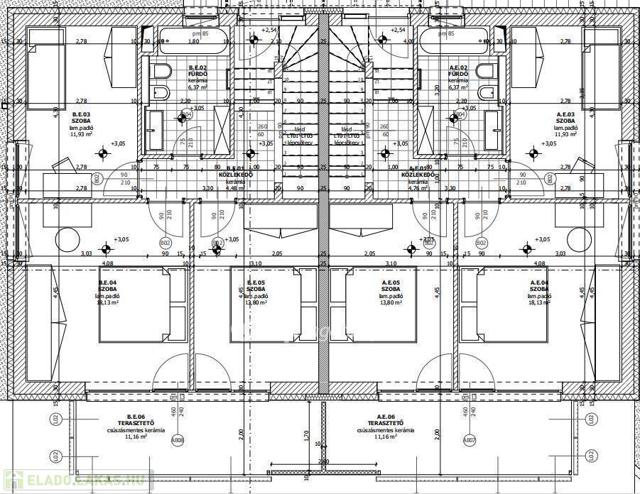 Az alapozás monolit vasbeton lemezalap, a földszint és emelet rész alatt lelépcsőzött monolit sávalap, illetve bekötött vasbeton alapgerenda szerkezetek. A pince falazat a lemezalapról indított, azzal vasalással összekötött vízzáró monolit vasbeton szerkezet, tartószerkezeti terv szerint. A földszinten általánosan 20cm monolit vasbeton fal, az emeleten pedig vázkerámia falazóblokkal kialakított 30 cm vastag falazat készül. A vasbeton fal előtt 20cm EPS, a falazott fal előtt 15 cm EPS hőszigetelés készül. A válaszfalak 10cm vastag vázkerámia szerkezetek. A födémek helyszíni monolit vasbeton szerkezetek, a pince fölött 25cm, a földszint és emelet fölött 22 cm vastagságban. Az erkélylemez 22cm vastag, a födémszerkezethez konzolosan hőhíd megszakítókkal csatlakoztatott vasbeton lemezkonzol.