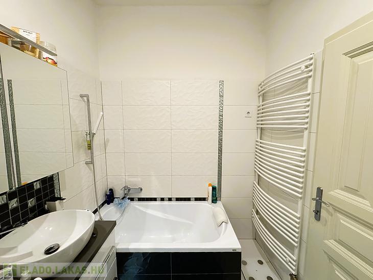 A fürdőszoba új burkolatot kapott és új akrilkáddal rendelkezik. A mosógép ebben a helyiségben kapott ki- és beállást.