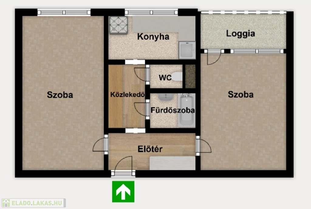 Az ingatlan elosztása rendkívül praktikus: két külön nyíló szoba biztosít kényelmes életteret akár pároknak, kisebb családnak vagy befektetési célra is ideális választás lehet. A nappaliból nyíló loggia kellemes kikapcsolódási lehetőséget nyújt, ahonnan zöld parkra nyíló kilátás fogad – tökéletes helyszín egy reggeli kávéhoz vagy esti pihenéshez.