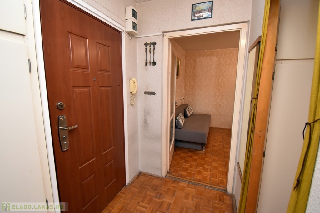 A fürdő, konyha és a WC padlója jó állapotú linóleummal, a többi helyiség fa parkettával burkolt. A bejárati ajtó több ponton záródó, modern biztonsági ajtó.