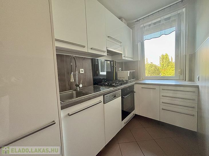 A konyha a lakás egyik ékköve: felújított, modern hangulatú, igényesen kialakított, és bőséges munkafelületet kínál a mindennapi főzéshez.