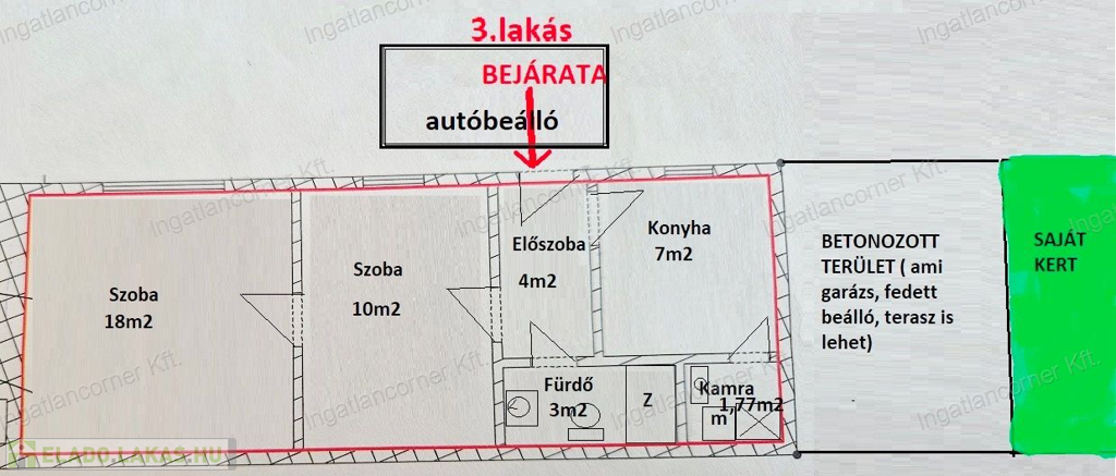 - JOGI HÁTTÉR: Jelenleg ügyvéd által késztett megosztással szerződéssel rendelkezik az ingatlan (ami nem csak a lakásokat tartalmazza, hanem a felosztott telek és kerthasználatot is) így az ingatlan hitelezhető. De a társasház alapítást már a lakóközösség kezdeményezte, amely még jelenleg folyamatban van.