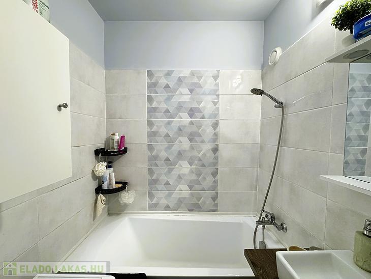 A fürdőszoba új burkolatot kapott és új akrilkáddal rendelkezik. A mosógép ebben a helyiségben kapott ki- és beállást, a WC egy külön helyiségben található.