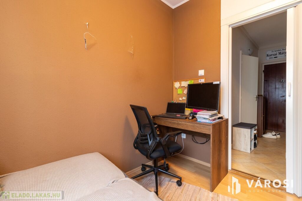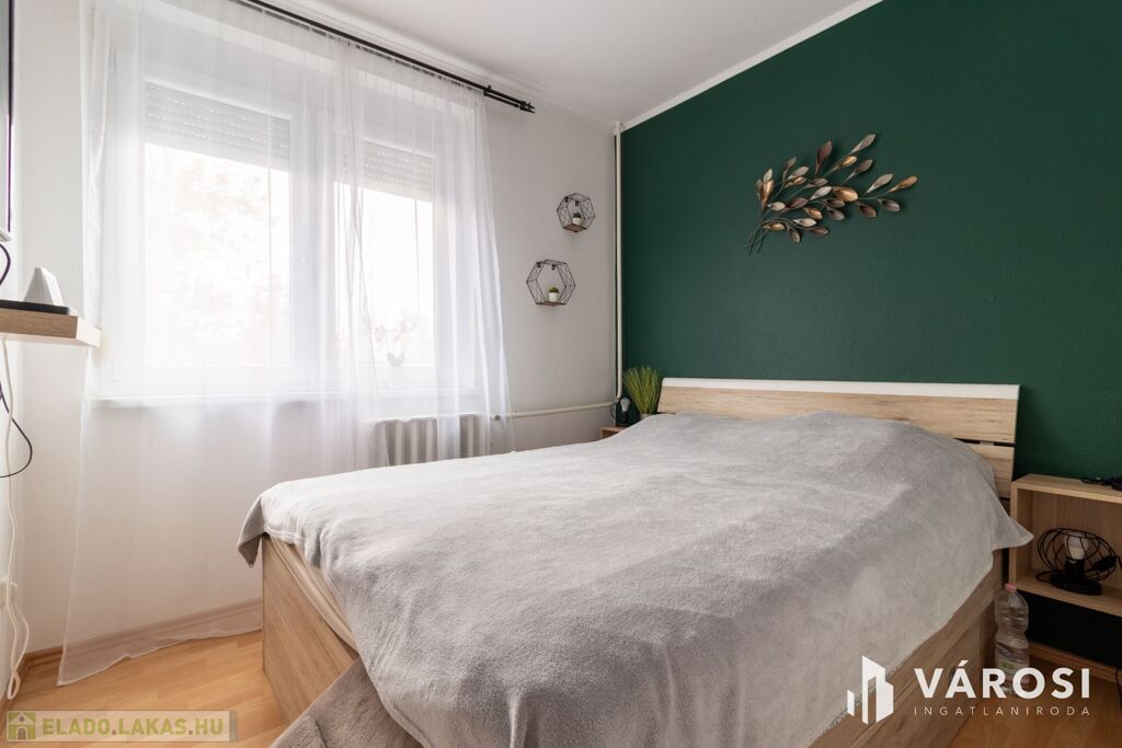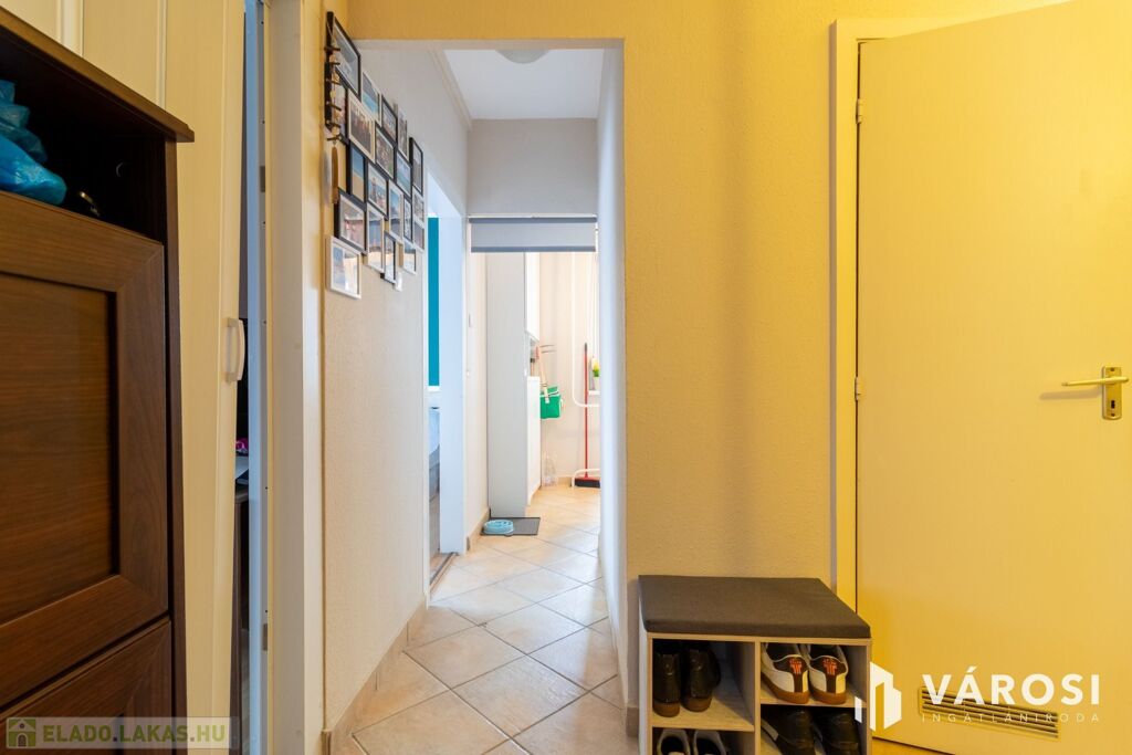 A lakás világos, praktikus elosztású: a szobákban laminált padló, míg a közlekedőben, konyhában, fürdőben és WC-ben hidegburkolat található.
