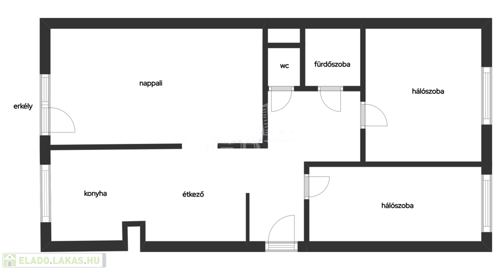 A lakás elosztása, 2 hálószoba és egy nappali, konyha étkezővel, fürdő és WC külön helyiségben, amelyek tökéletesek családok számára vagy akár otthoni munkavégzésre is.
