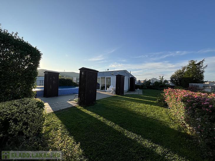 A társasház 2003-ban épült, liftes ház. A tetőterén egy panorámás wellness részleg medencével szolgálja az ott lakók nyugalmát.