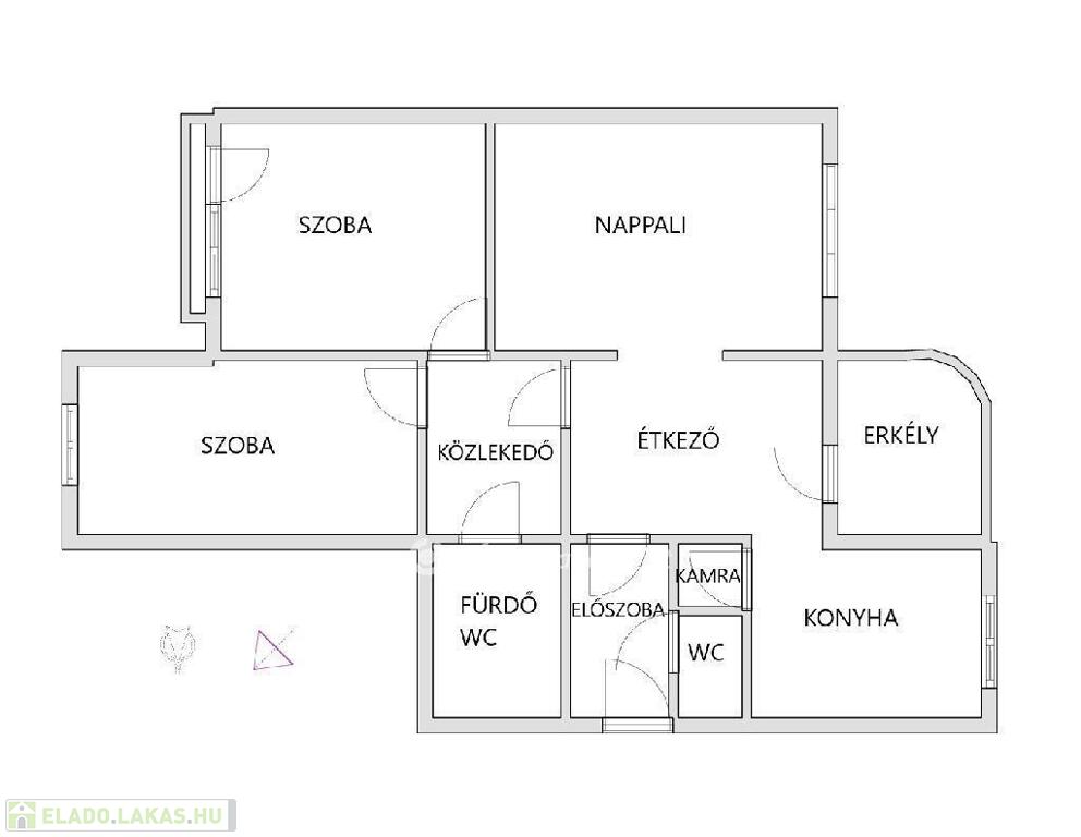 Az ingatlan jelenleg nappali+konyha+spajz+étkező+gardróbszoba+2 hálószoba+ wc-s fürdőszoba+1 wc elrendezésű.