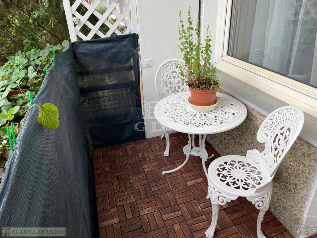 A 3 m²-es erkély tökéletes hely a reggeli kávé élvezetére, csodálva a nyugodt, zöld környezetet.