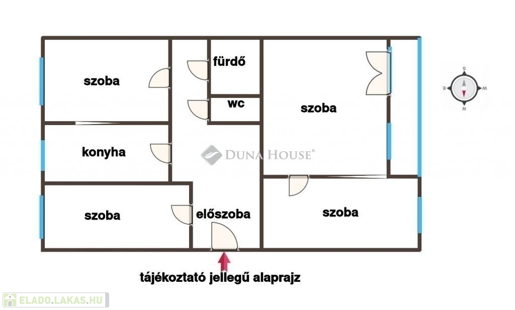 Tájolás: K és NY, Két szoba és a konyha ablakai keletre, míg a másik két szoba és az erkély ablakai nyugatra néznek.