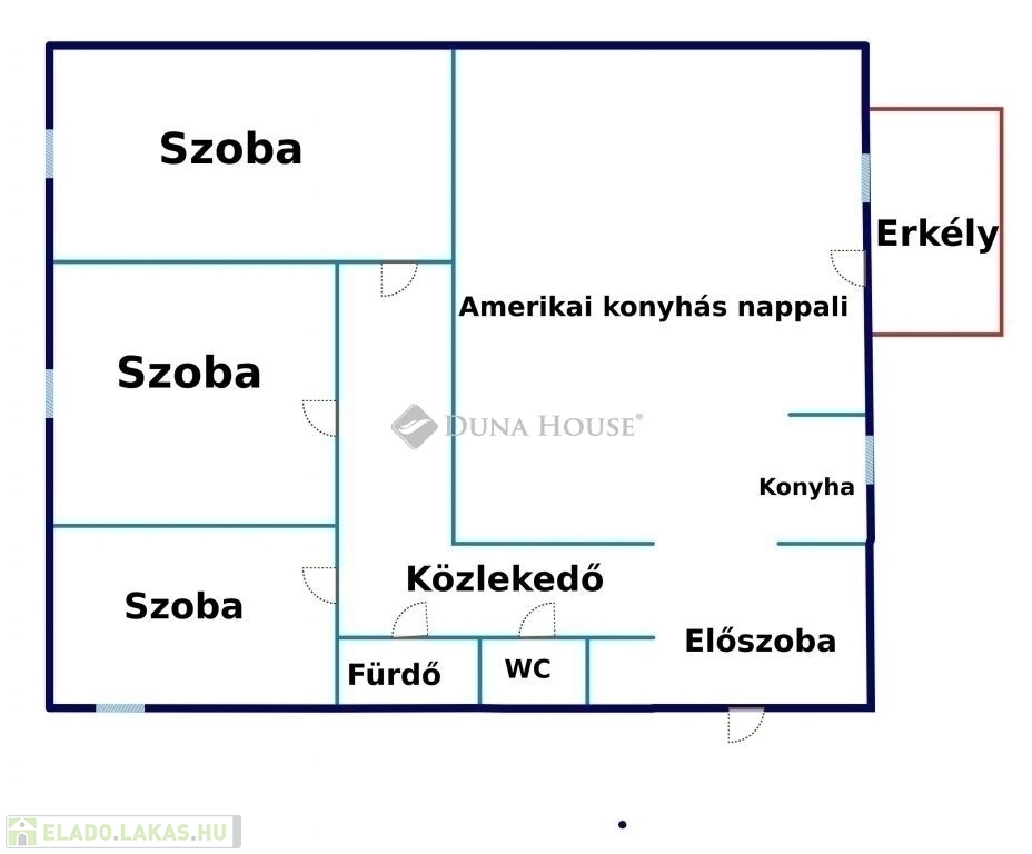 Elrendezés:- amerikai konyhás nappali,- 3 külön nyíló szoba,- erkély,- külön fürdőszoba és WC.