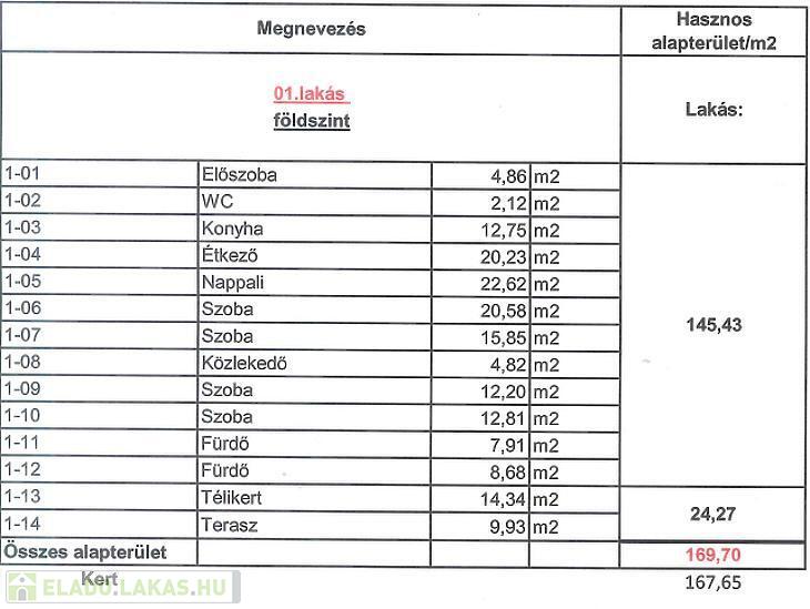 1. lakás: földszinten található nettó: 145,43nm-es (bruttó 169,7nm) amerikai konyhás nappali+ 4 hálószobás lakás. Az ingatlanhoz tartozik egy 14,34nm-es télikert, egy 9,93nm-es terasz és egy saját használatú kert ami 167,65nm.