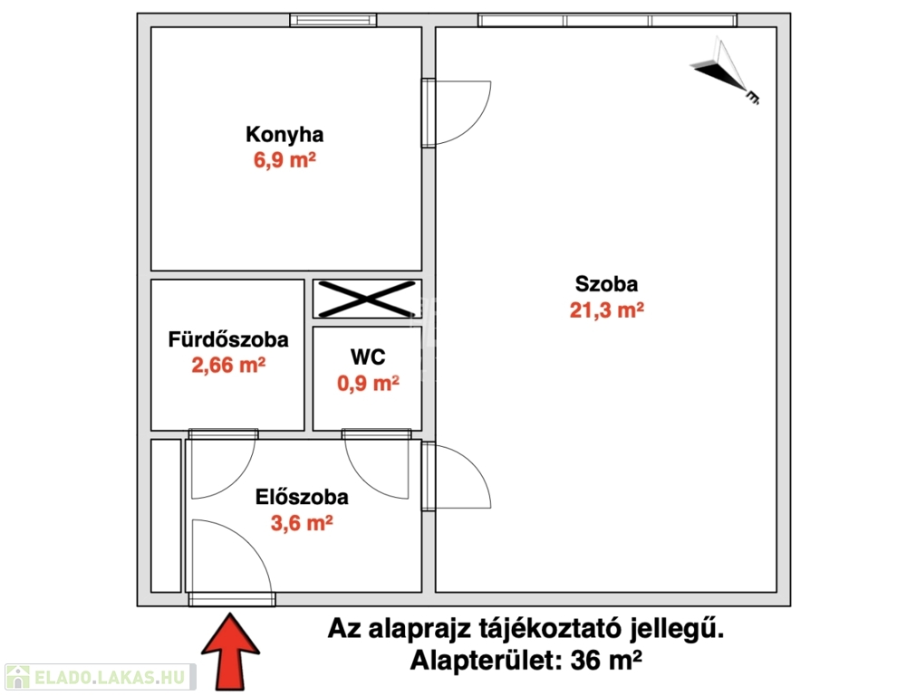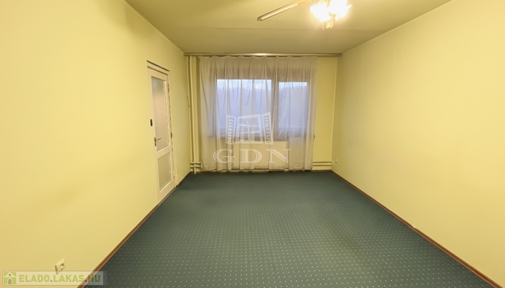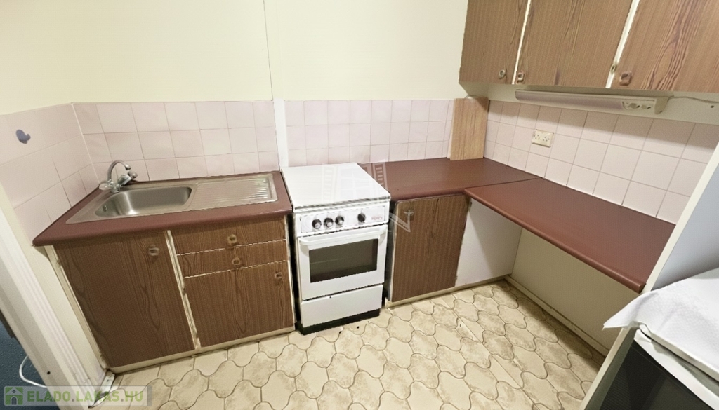 Az előszobából külön nyílik a fürdőszoba és a WC, itt kapott helyet egy beépített gardróbszekrény is. A tágas, padlószőnyeggel burkolt szobából nyílik a konyha, amely ablakos, konyhabútorral felszerelt.