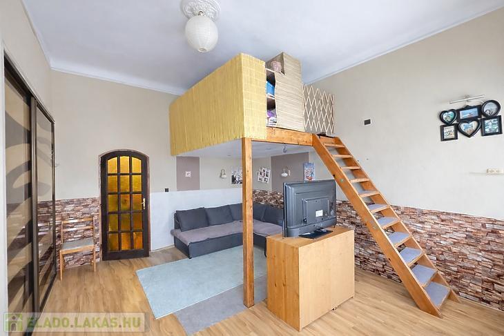 A lakás belmagasságának köszönhetően már kialakításra került galéria, illetve a tetőtér beépítése is elkezdődött (szigetelés + gipszkarton).