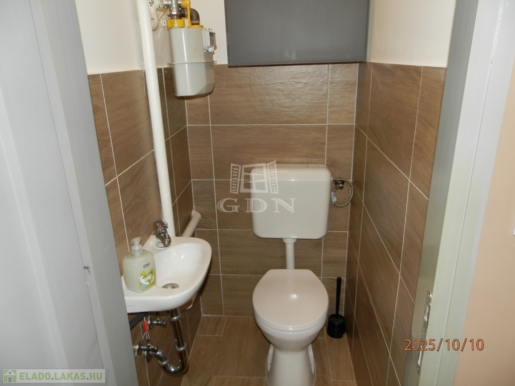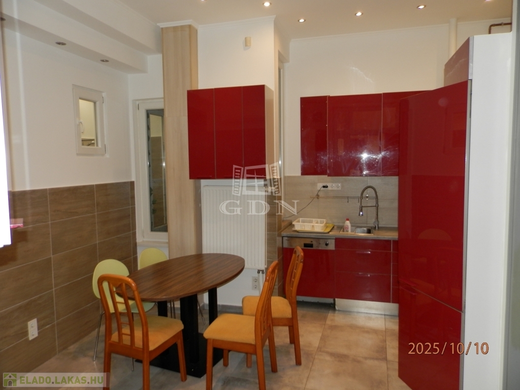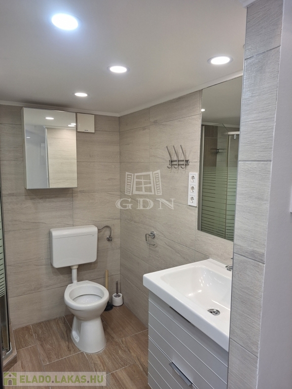 A 58 m²-es lakás tágas, világos, két fürdőszobás, akár két külön bérlő számára is ideális.