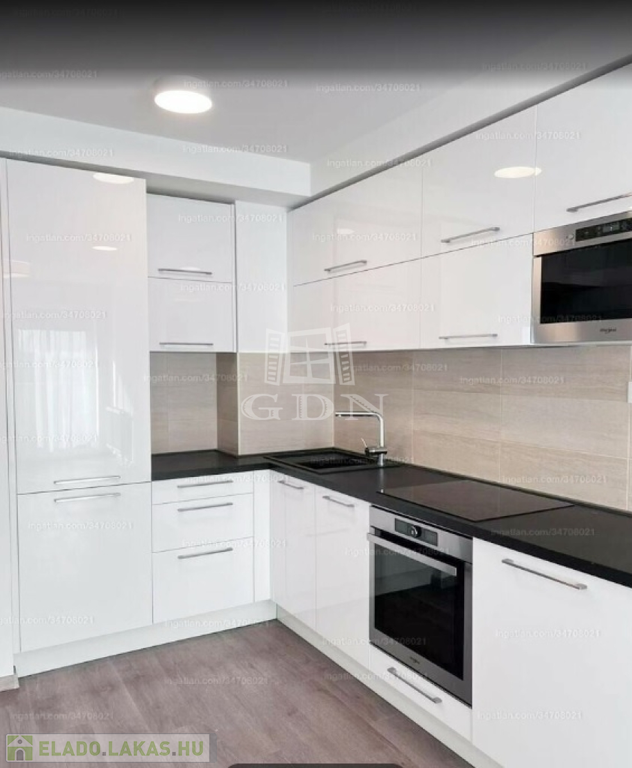 A konyha teljesen gépesített, újonnan beépített, Whirlpool márkájú minőségi berendezésekkel: sütő, főzőlap, mikró, hűtő és mosogatógép is rendelkezésre áll – így az új tulajdonos azonnal használatba veheti.