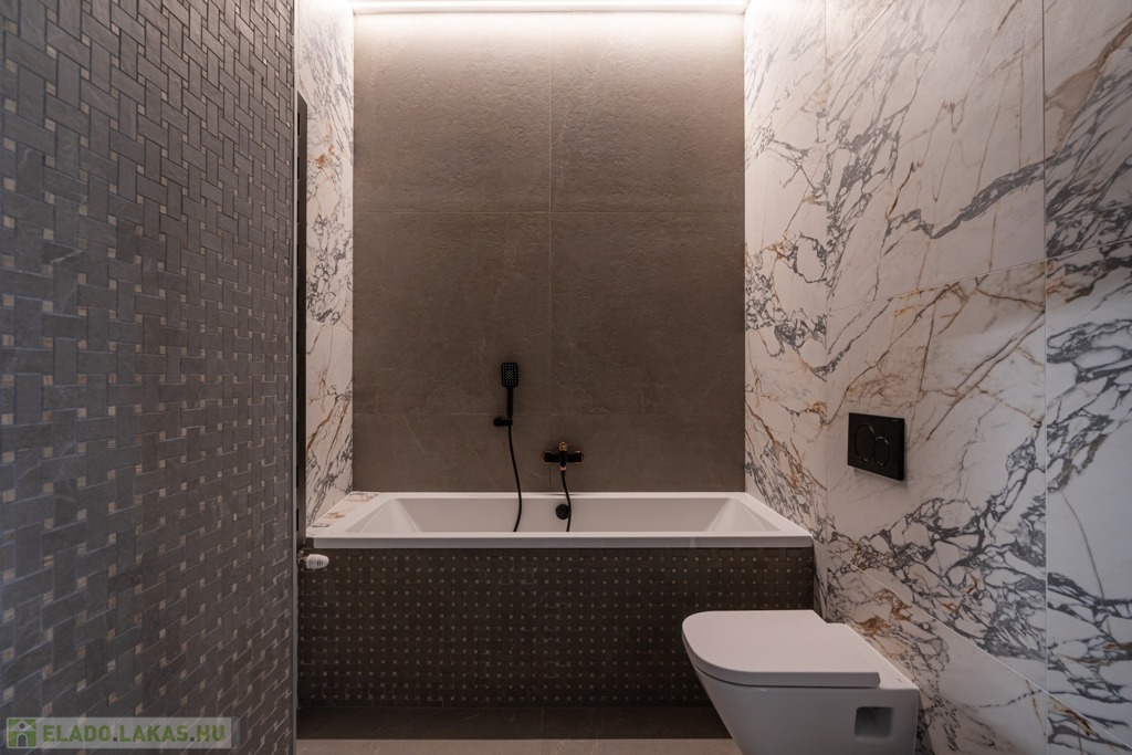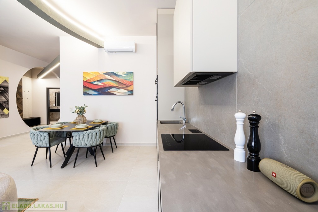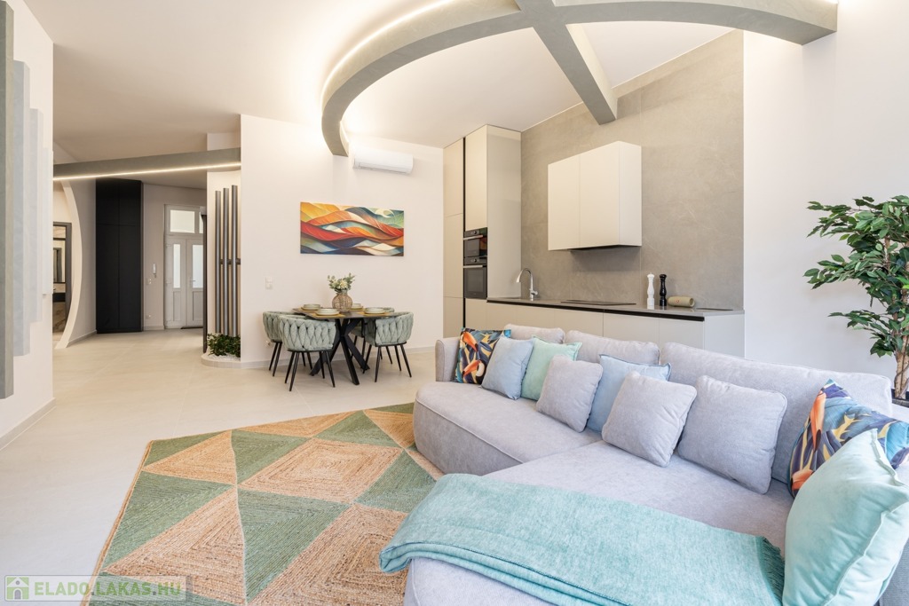 A lakás 2025 májusában esett át teljes körű felújításon, melyet belsőépítész tervezett és prémium anyagok, egyedi formák, íves falak és különleges felületek tesznek igazán különlegessé. Az ingatlan hangulata egyszerre modern, elegáns és otthonos, minden részletében a magas színvonalú kialakítás és a kifinomult ízlés tükröződik.