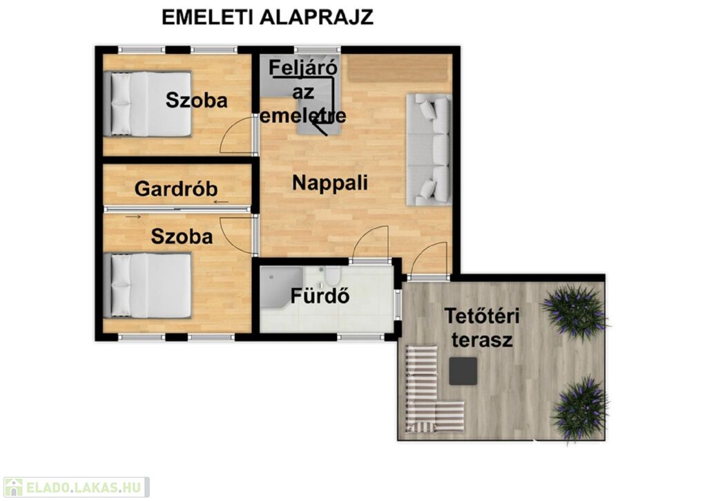 -belső lépcső köti össze a 2 szintet