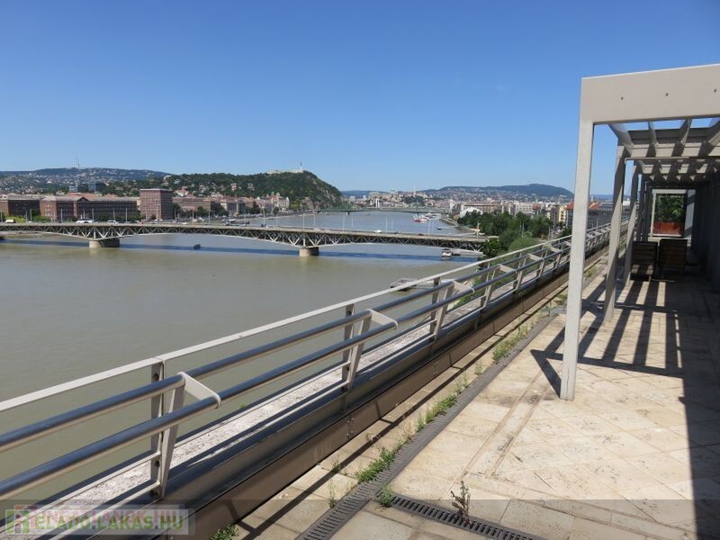 A 24 órás portaszolgálattal ellátott palotában a legfelső, 9. emeleten nappali + 3 hálószobás terasszal és tetőkerttel, teremgarázsban 2 kocsibeállóval, tárolókkal eladó. A szobákból és teraszokról lenyűgöző a kilátás, lábunk előtt hömpölyög a Duna, túlparton az egyetemek, a Gellért hegy, a Dunai hidak, a lágymányosi Rákóczi hídtól a Petőfi hídon, a Kossuth hídon keresztül az Erzsébet hídig. Nappal és este is pazar a panoráma. A házban minden szolgáltatás és közösségi helyiség megtalálható: beltéri nagy úszómedence, gyerek medence, termálvizes medence, jakuzzi, szauna, squash pályák, felszerelt tornaterem, edző és masszőr külön díjazás nélkül jár az elit lakóknak.