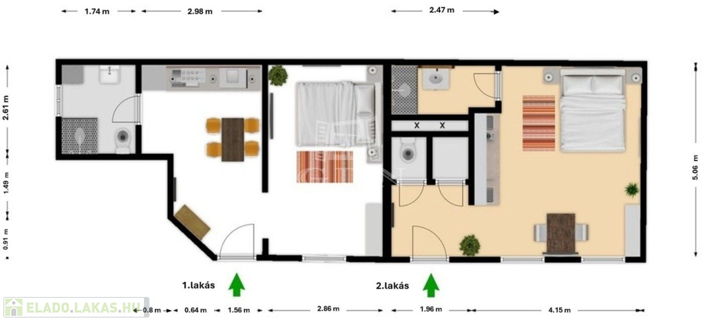 28 nm alapterület: közlekedő, WC, kamra, amerikai konxhás nappali szoba, fürdőszoba