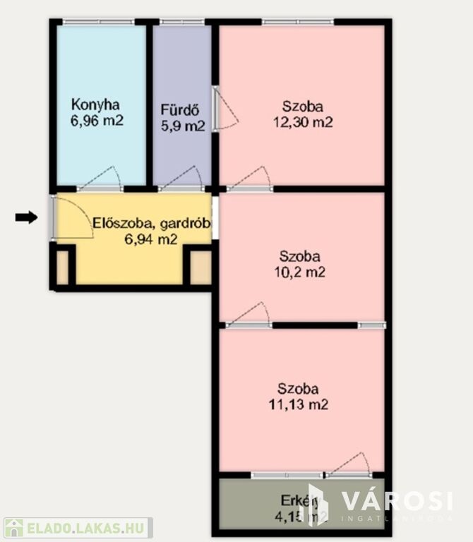 Az ingatlan a tulajdoni lap szerint kétszobás, de három szobássá lett alakítva, amely elrendezést a csatolt alaprajzon megtekinthet.