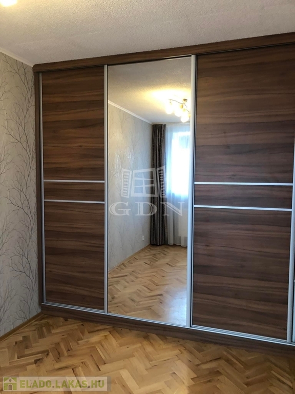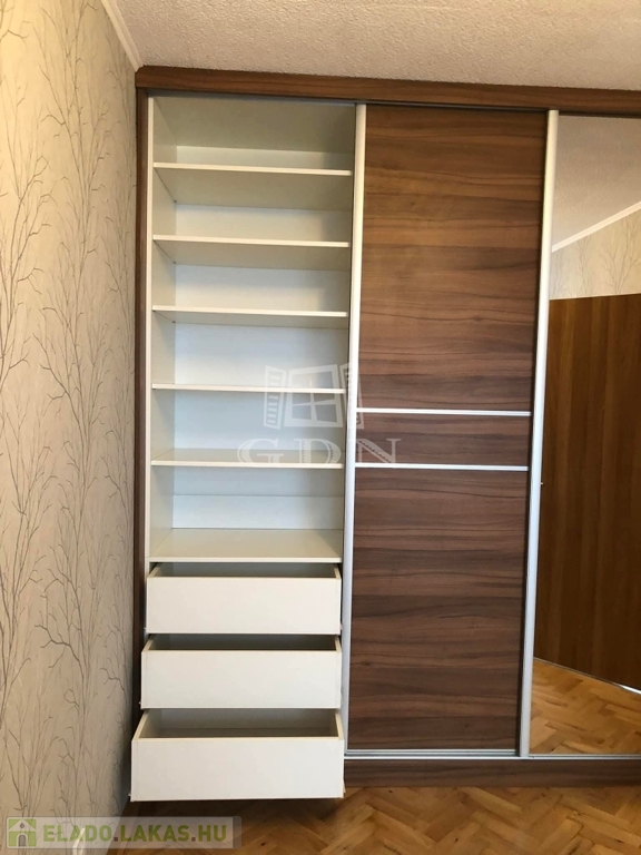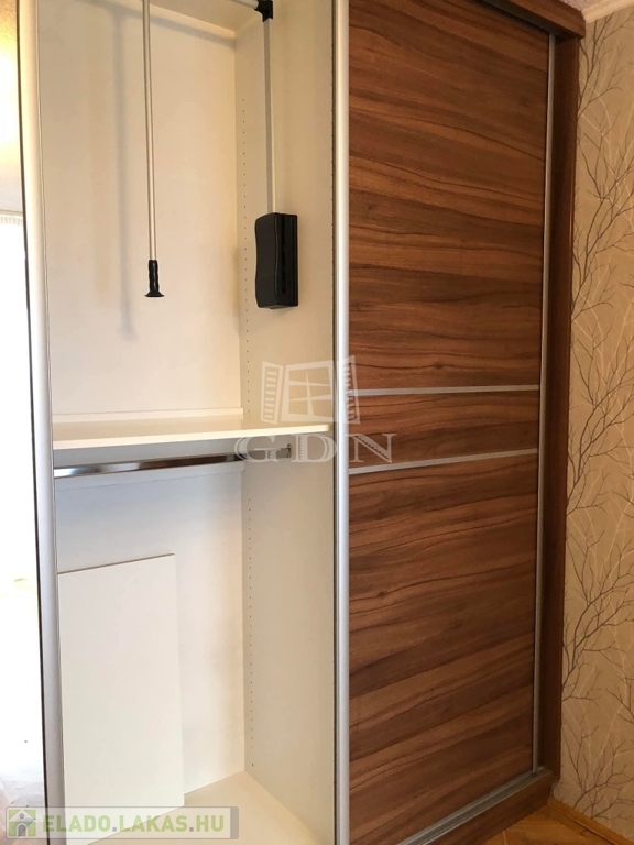 Az előszobában teljes hosszban beépített szekrény, a hálószobában három tolóajtós gardrób kapott helyet.