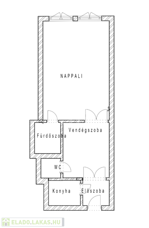 előszoba, hall, melyből egy szoba nyílik, étkező, konyha, fürdőszoba, vendég-WC.