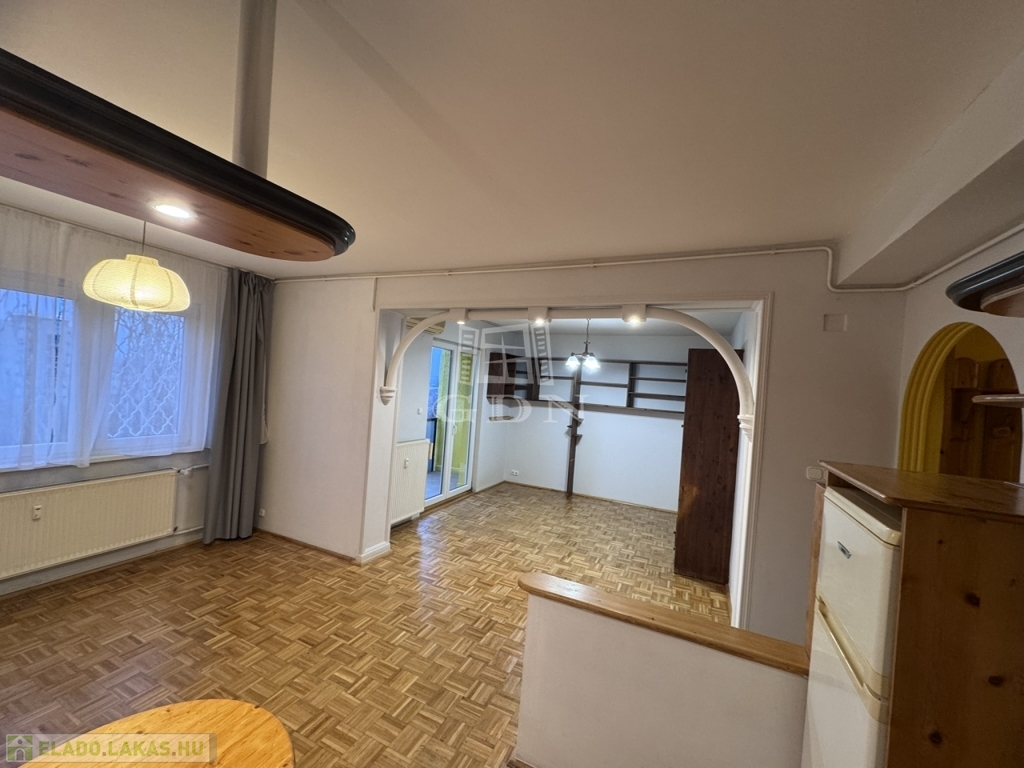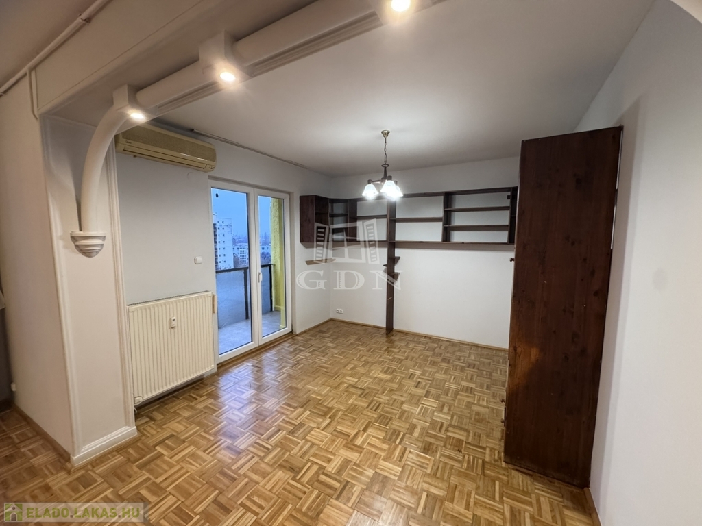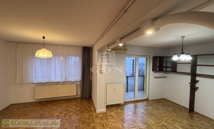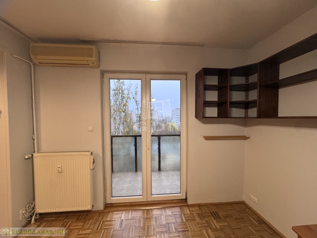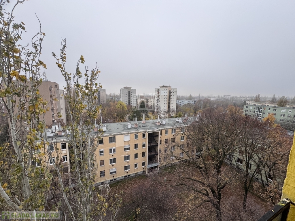 A lakás hetedik emeleti nyugalma felülről mutatja meg a város egyik legszebb arcát: fás, barátságos házak, a távolban a budai dombok – egy olyan panoráma, amitől minden nap jobb kedvvel indulsz el otthonról.