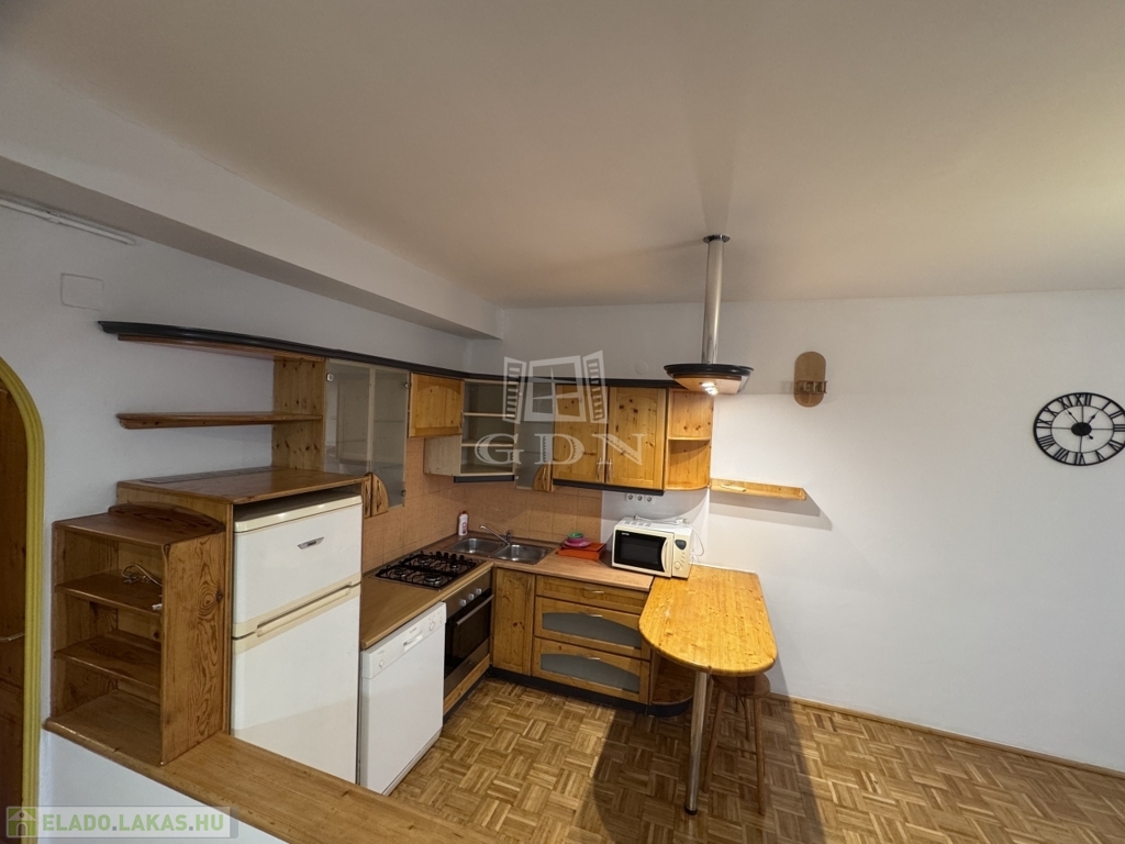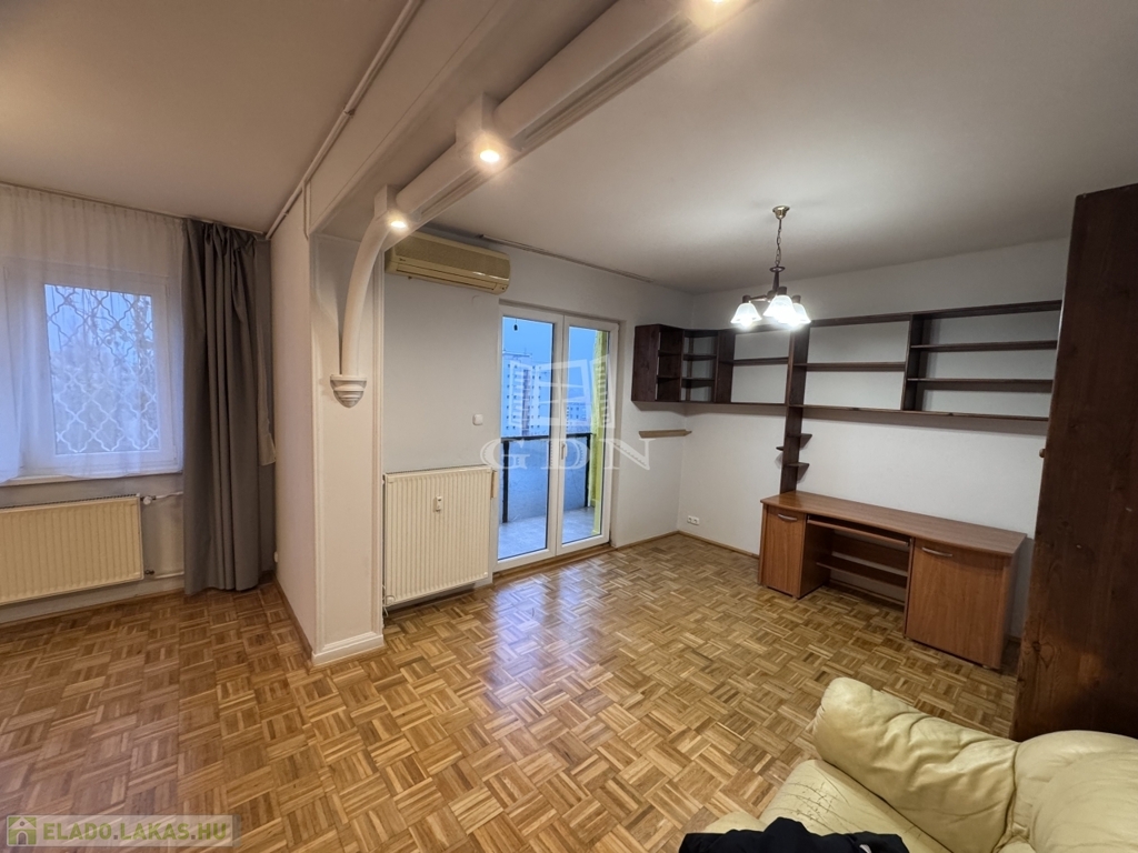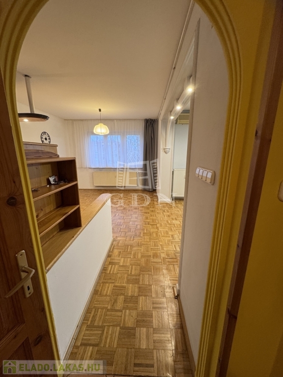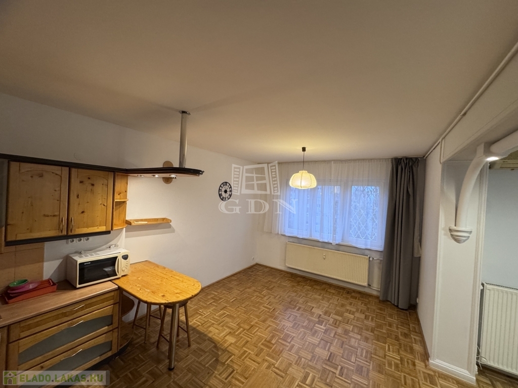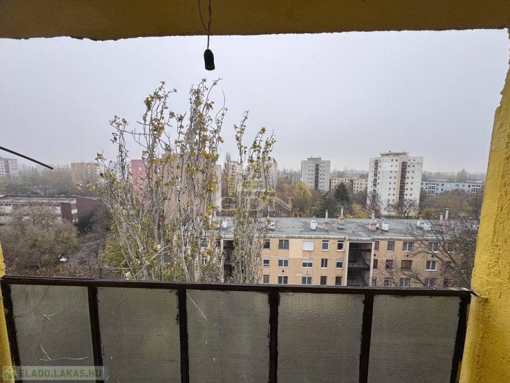 A lakás hetedik emeleti nyugalma felülről mutatja meg a város egyik legszebb arcát: fás, barátságos házak, a távolban a budai dombok – egy olyan panoráma, amitől minden nap jobb kedvvel indulsz el otthonról.