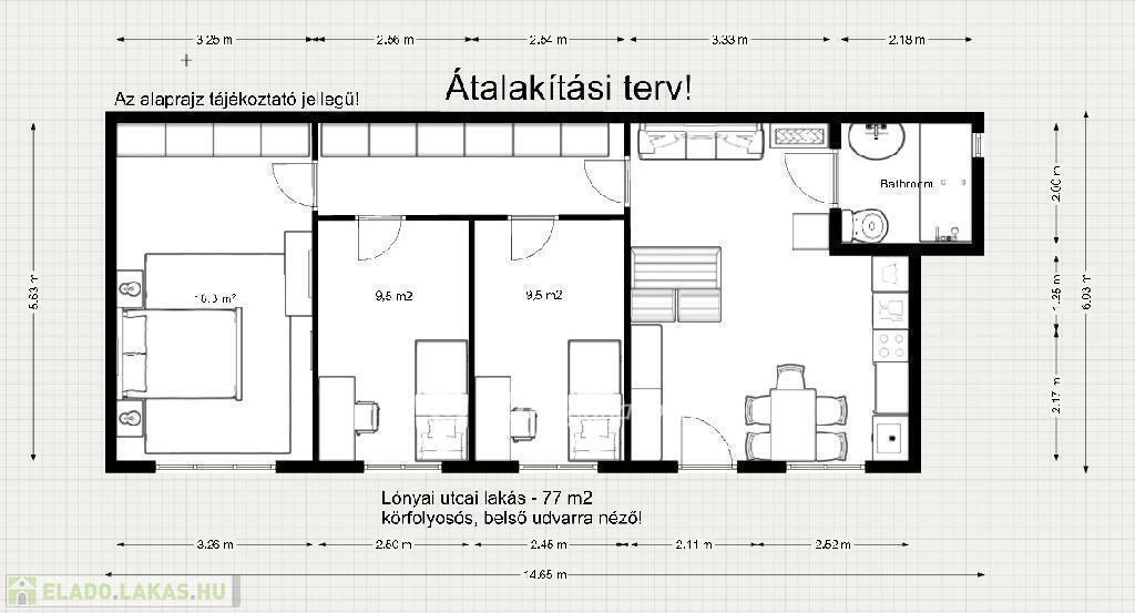 A mellékelt átalakítási terv szerint kialakítható egy szülői és két kisebb hálószoba, illetve egy amerikai konyhás nappali. A tervezett felújítás jelentősen felértékeli az ingatlant. Ugyanakkor két külön lakás is kialakítható belőle!