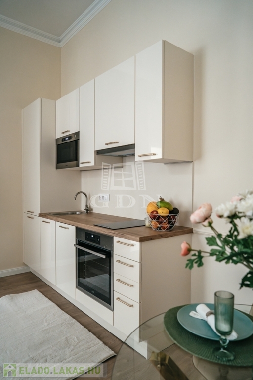 – A lakás konyhája teljesen gépesített (Bosch és Whirlpool márkák: sütő, főzőlap, hűtő, mosogatógép, mikrohullámú sütő, páraelszívó)