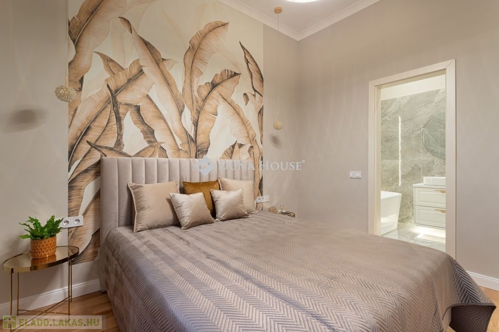 A lakás magas belmagasságú, chevron parkettás, modern gépesítéssel (Daikin klíma, Bosch kazán, AEG gépek), új vezetékekkel és nyílászárókkal. A tágas amerikai konyhás nappali napfényes és elegáns, mindkét hálószoba saját fürdőszobás (egyik káddal, másik zuhannyal).