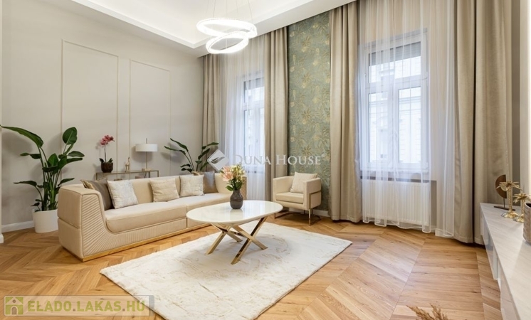 A lakás egy rendezett, liftes, nagypolgári ház 3. emeletén található, teljes körű, prémium minőségű felújításon esett át, így új tulajdonosa azonnal birtokba veheti berendezéssel együtt.