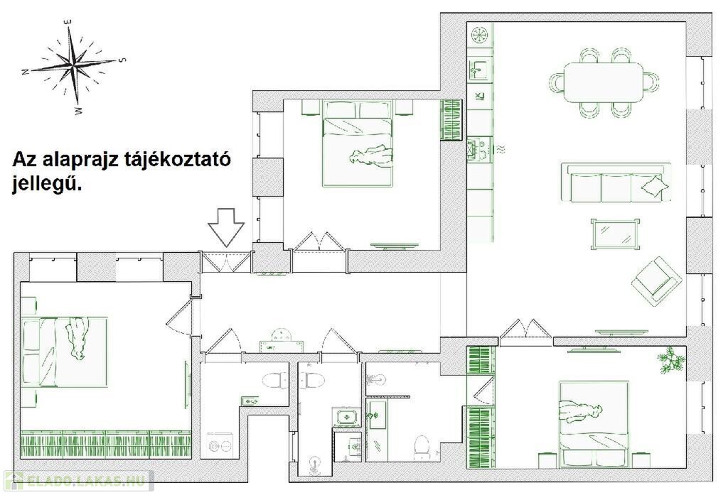 nagy étkező-konyhás nappali, 3 hálószoba, 2 fürdőszoba (master fürdő, privát zuhanyzós második fürdő, vendégmosdó)