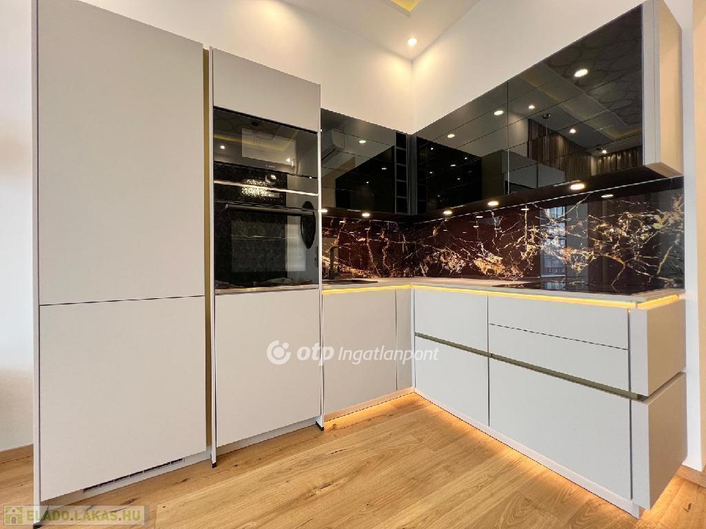 riasztó berendezés, svéd tölgyfa padló, elektromos redőny, okoskapcsolók, Nobilia konyhabútor automata mozgásérzékelőkkel, indukciós főzőlap beépített szagelszívóval, Bosh mosogatógép, hűtőgép.
