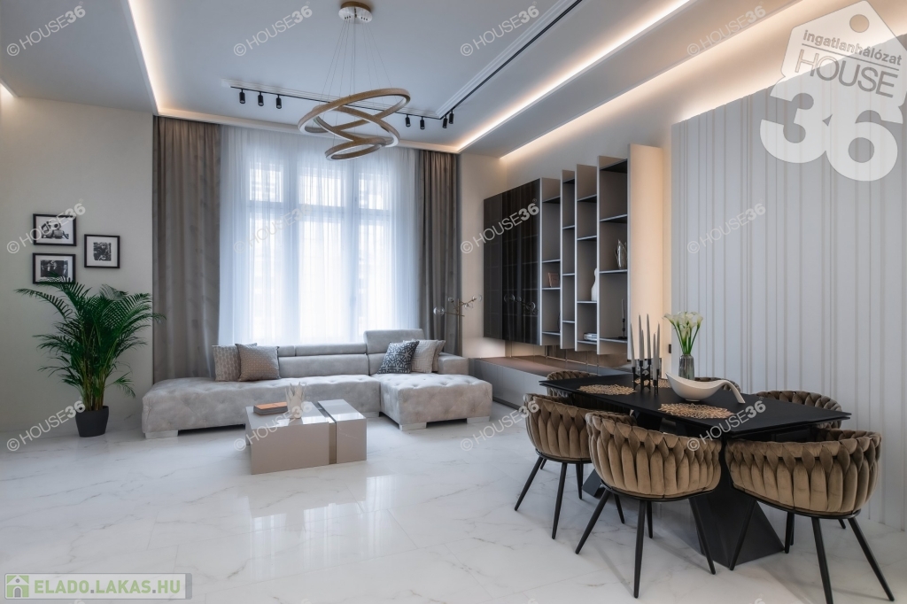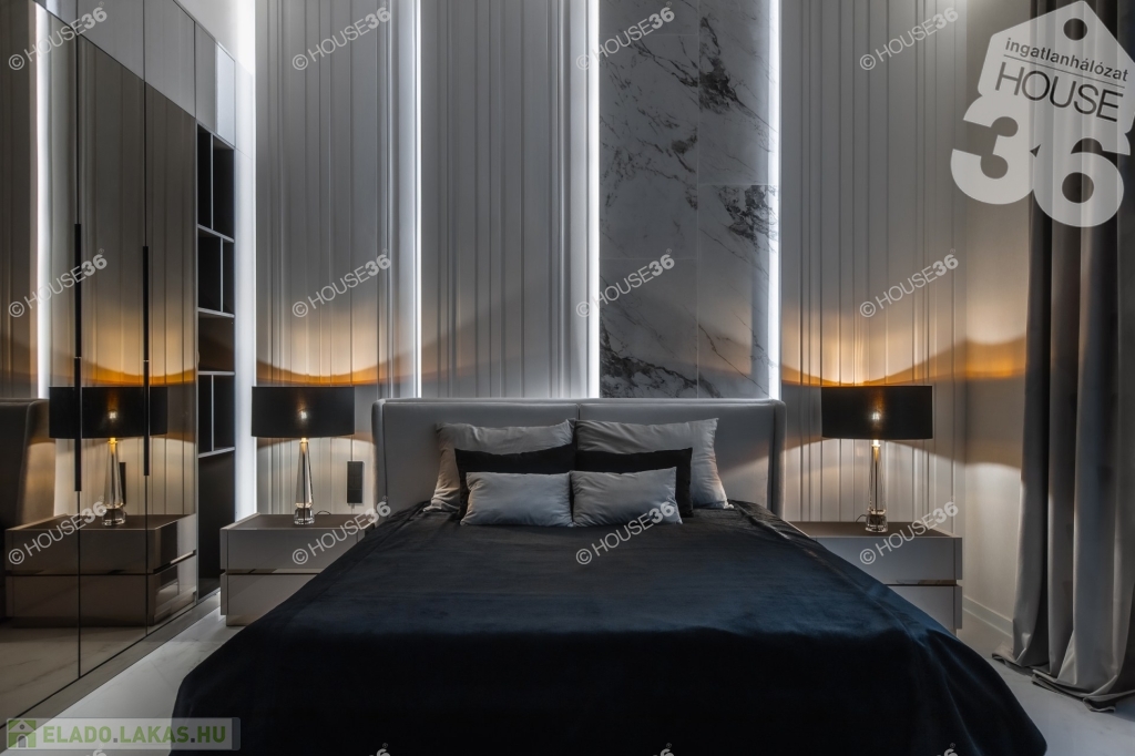 Neves tervezőiroda által megálmodott és egyedileg kivitelezett értékálló polgári lakás. Egyedileg tervezett bútorok, minőségi hidegburkolatok, led fény világítások mellett különleges Onyx kőből épitett bárpult is található.