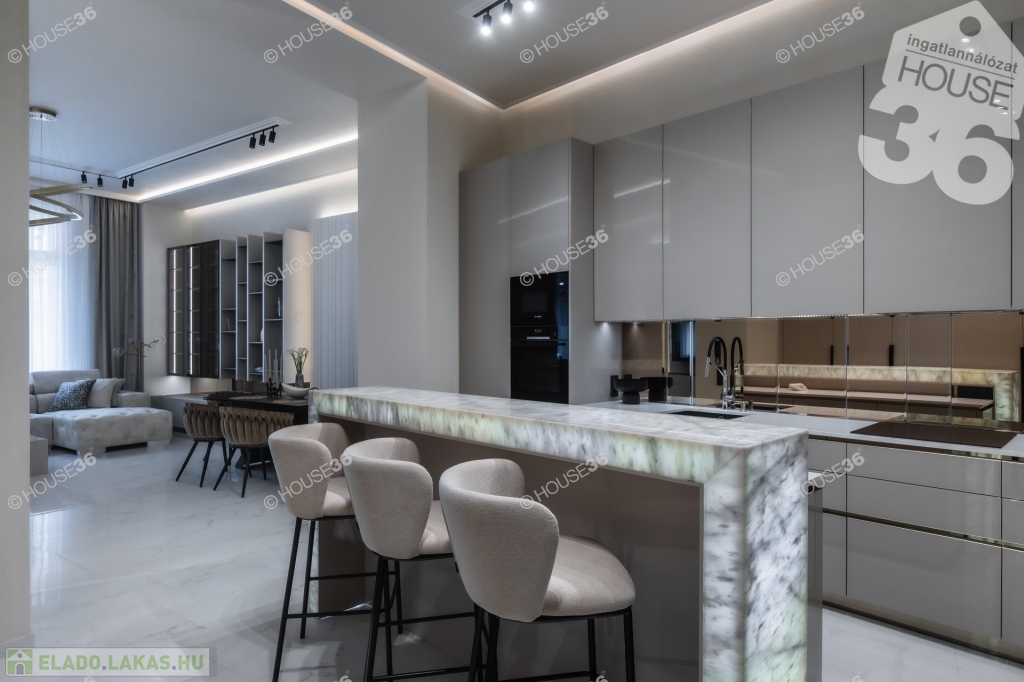 Neves tervezőiroda által megálmodott és egyedileg kivitelezett értékálló polgári lakás. Egyedileg tervezett bútorok, minőségi hidegburkolatok, led fény világítások mellett különleges Onyx kőből épitett bárpult is található.