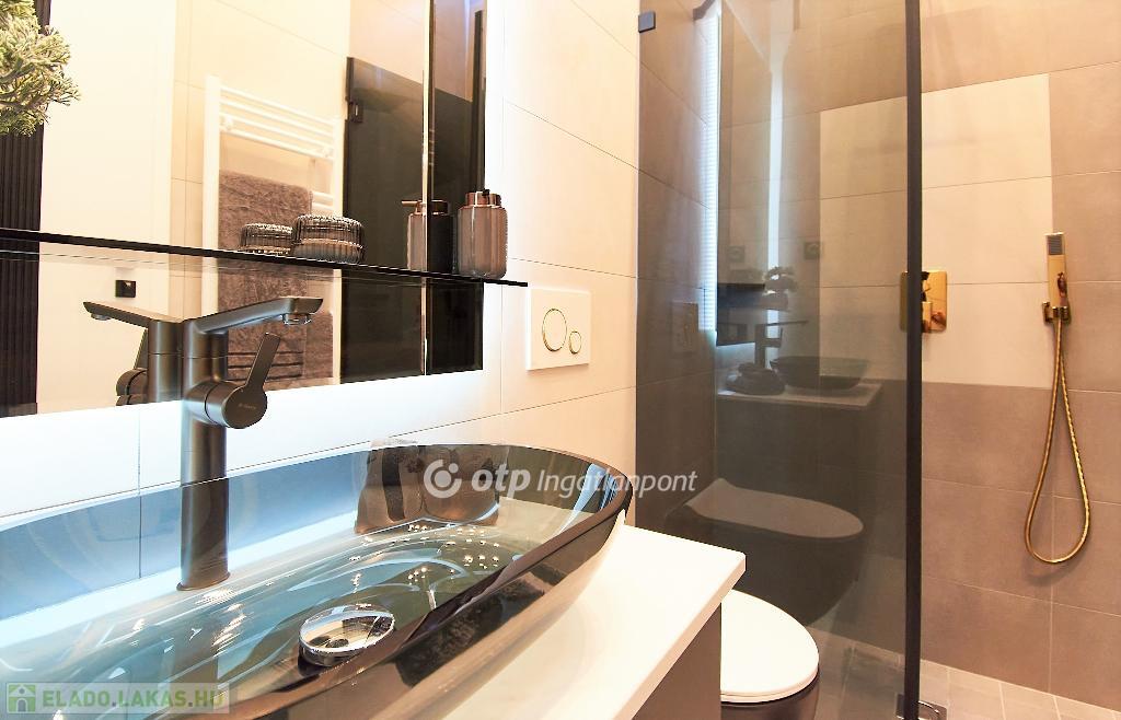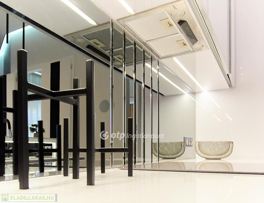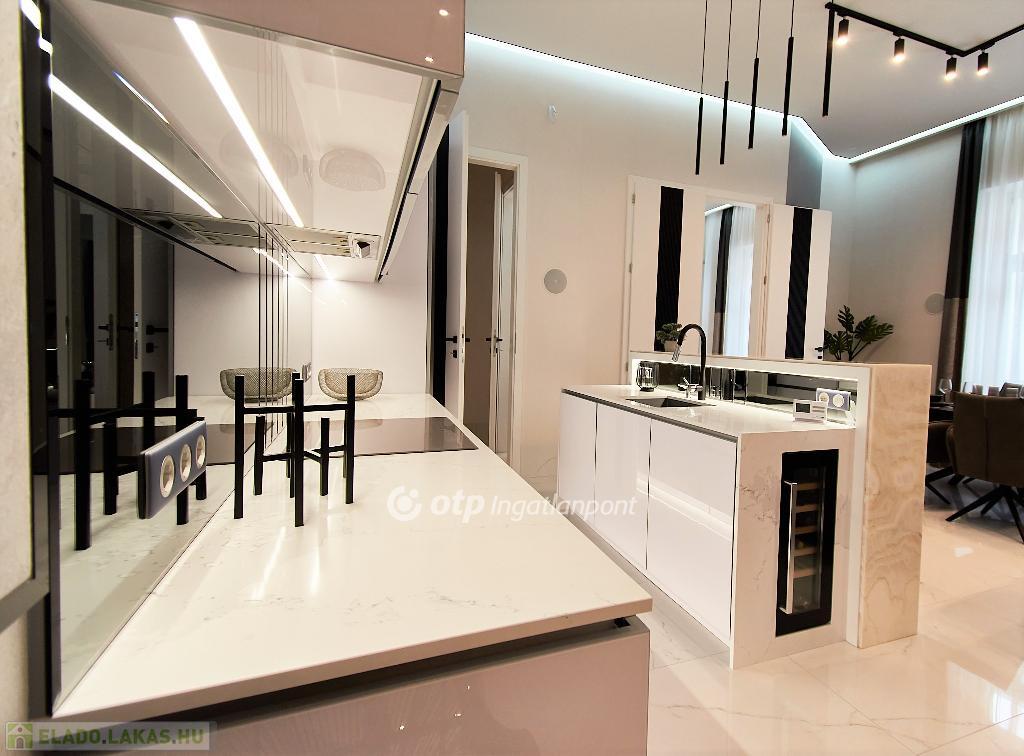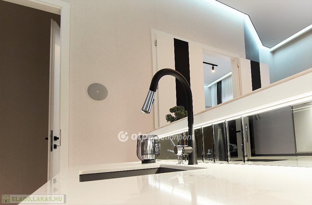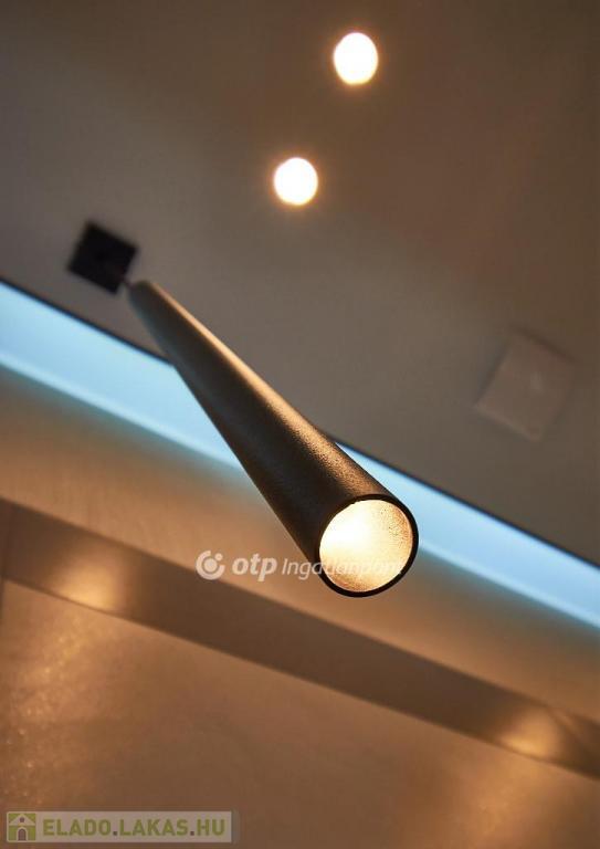 Felszereltség: - 3 rétegű üvegezés a 6 kamrás műanyag nyílászárókon (0,7K), - Motoros alumínium redőnyök, - Padló -és falfűtés Kondenzációs kazánnal, - Hűtő-fűtő klímarendszer Minden szobában, - Gépesített konyha, - Riasztó, Safe, - Ledes fő-és hangulatvilágítás rendszer, - Stand by kapcsoló rendszer, - HD Projektor, motoros vászon (12 nm) , -5.1.-es házimozi rendszer, Beépített Hangfalak, - Szauna, - Masszázs kád, - Teljes falfelület dryvit hálózva a repedések elkerülése érdekében, - Teljes falfelület tapétázva, - Teljes hangszigeteltség Blue Aqusto és Üveggyapottal, - Egyedileg gyártott fa ajtók, bútorok.