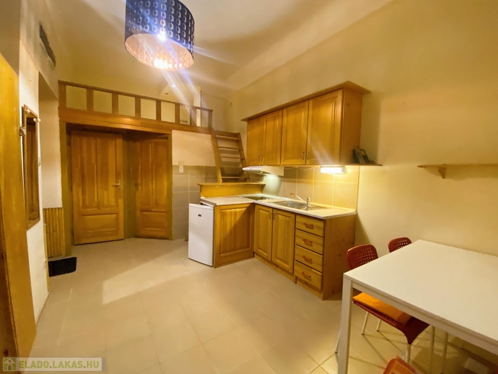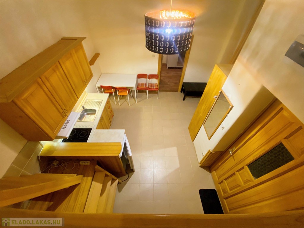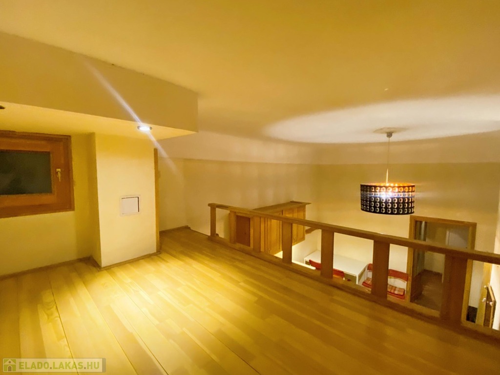 a bejáratnál egy barátságos nappali-konyha található, galériával, amely alkalmas tárolásra vagy akár egy plusz hálórész kialakítására is,