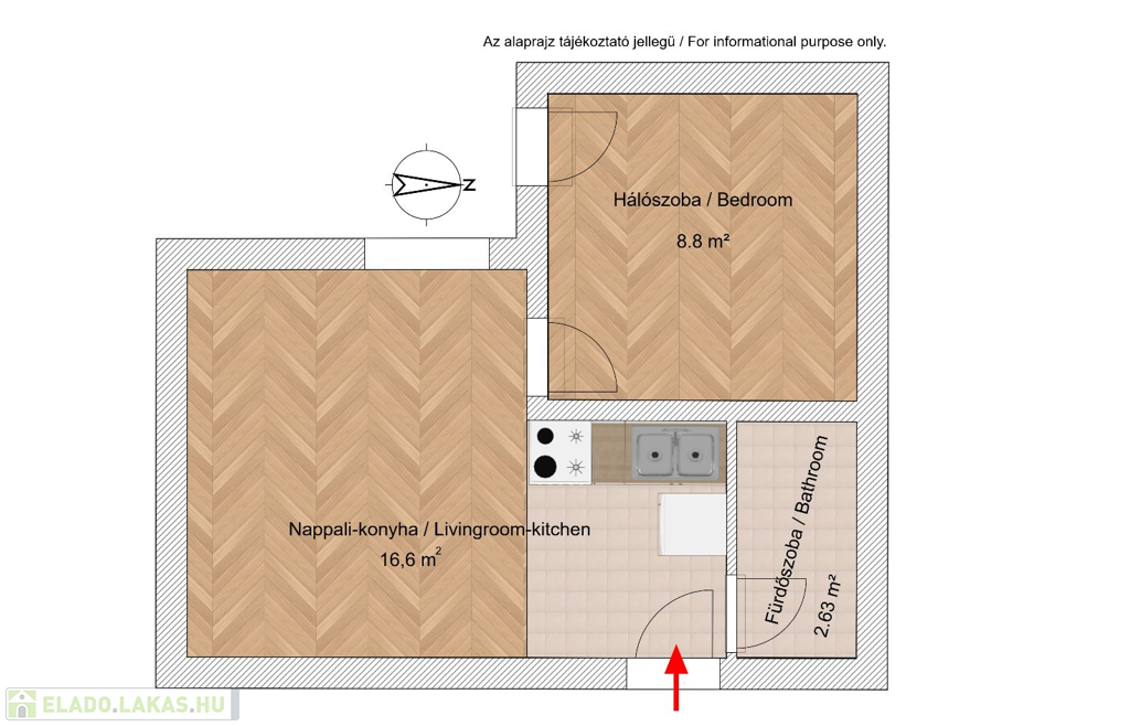 Előszoba + konyha-nappali kerámia burkolattal és laminált parkettával