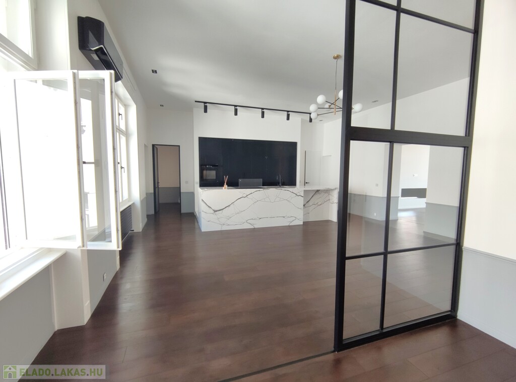 Bp., 5.ker. Belváros csendes, elegáns, mégis központi részén, Semmelweis utcában közel 300 nm-es, 6 szobás luxus lakás eladó egy felújított ház legfelső, teljes 5. emeletén, ahova lifttel juthatunk fel.