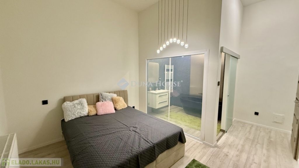 A master bedroom különlegessége az üvegfalú, PDLC fóliás (tejjüveges) fürdő, amely egyedülálló látványt nyújt. A csaptelepek digitális hőfokkijelzővel, a tükrök és világítások beépített LED rendszerrel működnek.