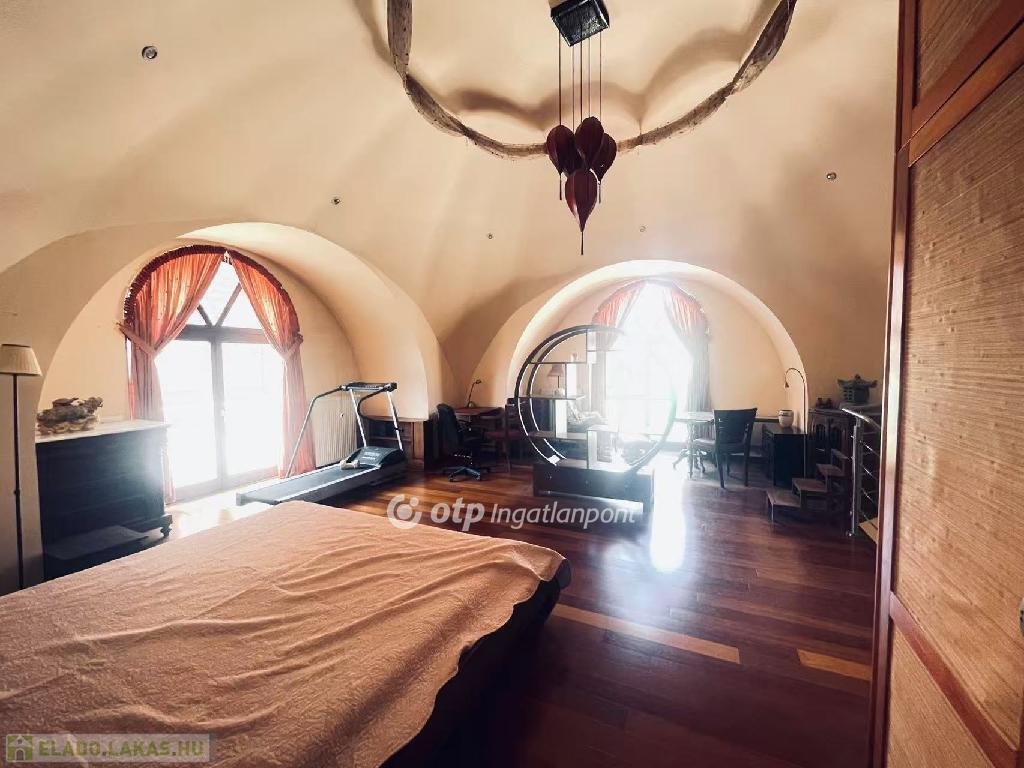 Az elegáns, tömör fából készült lépcső egy rendkívül tágas hálóhelyiséghez vezet az emeleten, mely igény esetén két különálló hálószobává is alakítható. Ezen a szinten található egy nagy méretű, beépített sarokgardrób is, mely praktikus tárolási lehetőséget biztosít.