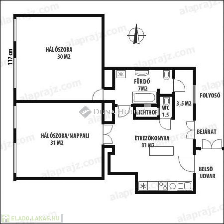 A lakásba lépve tágas konyha és étkező fogad, ahonnan egy hangulatos, növényekkel teli belső udvarra is kiléphetünk.