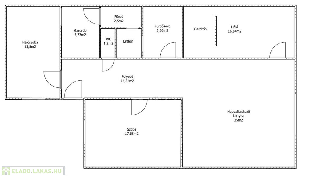 Elrendezés: nappali + 3 külön nyíló szoba