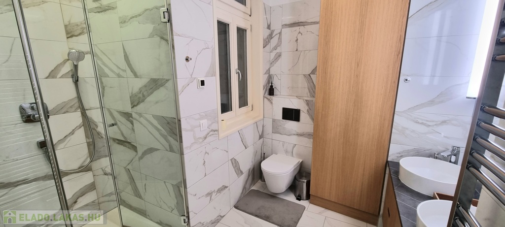 A fürdőszobában az épített zuhanyban egy elektromosan nyíló ablak is szolgálja a kényelmet (a nagyobb ablak mellett).