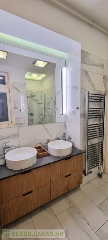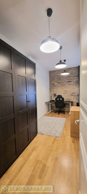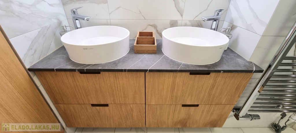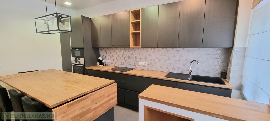 A lakás minden helyiségében igényes asztalosmunkának lehetünk tanúi, ezt mutatja többek között a megvilágított tálalószekrény és az igény esetén bővíthető hatalmas konyhasziget/étkezőasztal is.