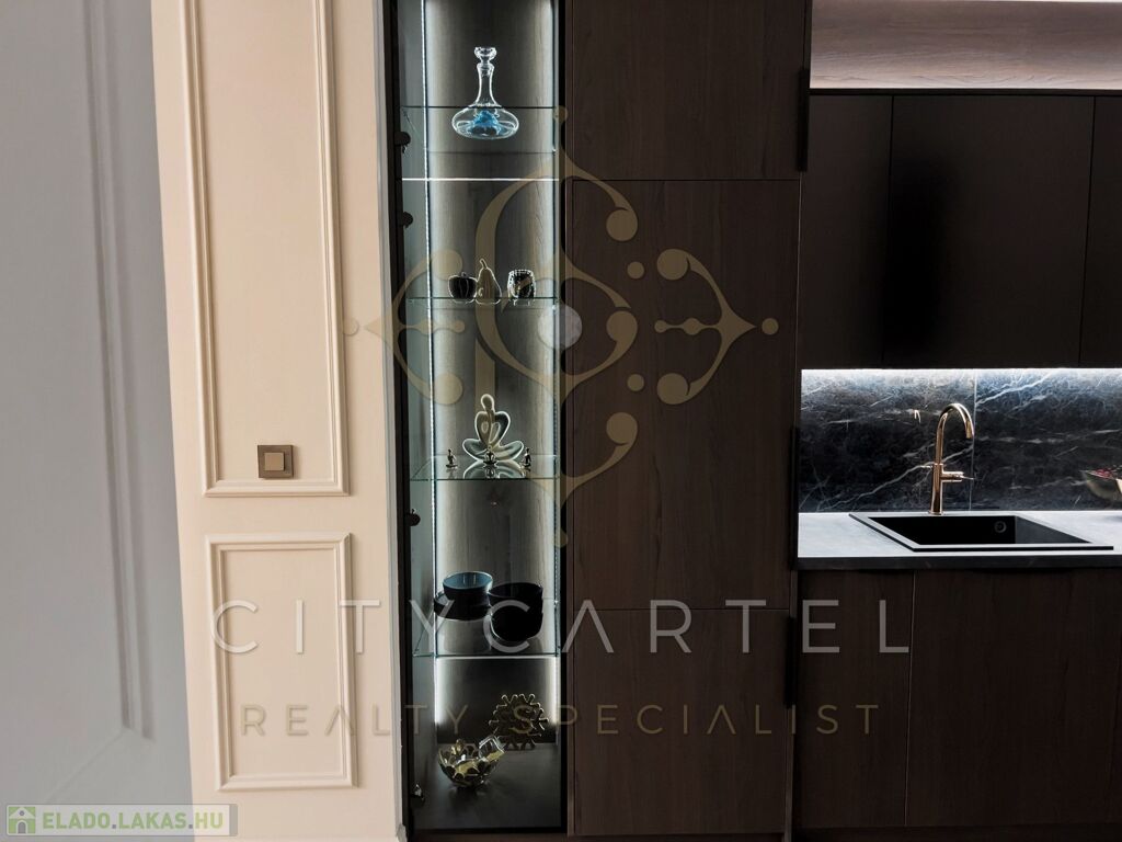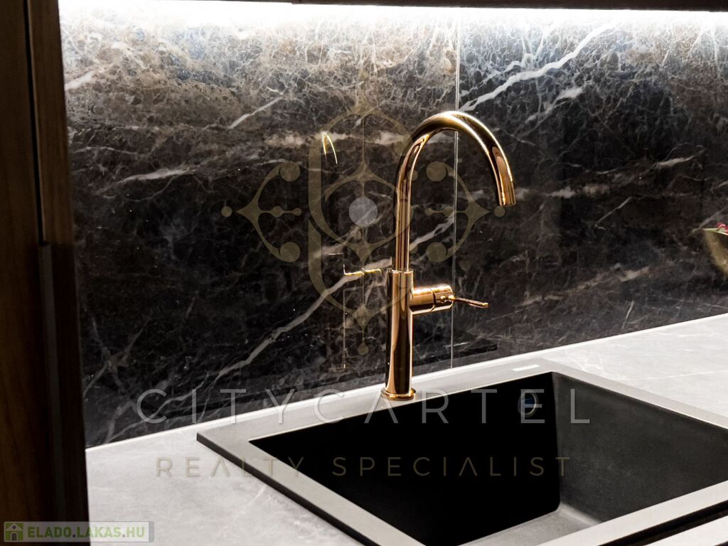 A lakás egyik különlegessége a tágas konyha, ahol konyhasziget kapott helyet, benne beépített borhűtővel, ami igazi kényelmi pluszt nyújt a mindennapokban. Emellett található egy külön kis háztartási helyiség, ahol a mosógép és a szárítógép került elhelyezésre – praktikus, zajtól elszeparált megoldás.
