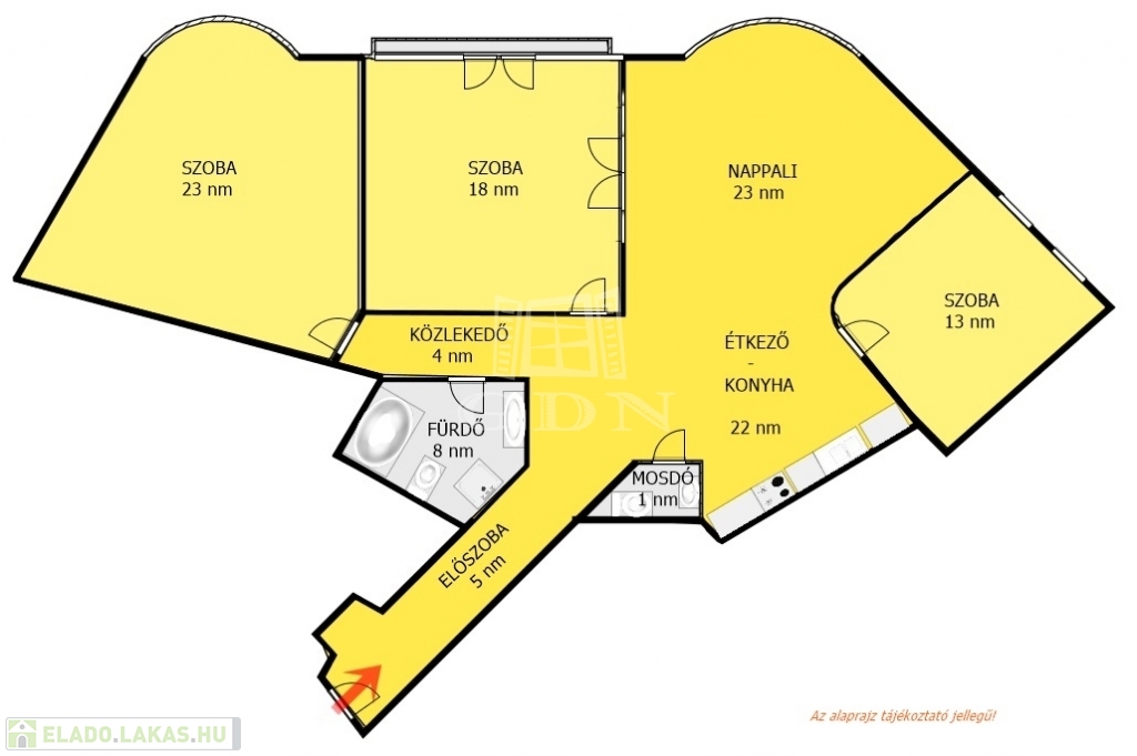 Jelenleg étkezővel és a konyhával egybenyitott nappali, valamint 3 külön bejáratú szoba elrendezésű. A belső terek, igény szerint, könnyedén átszervezhetőek, alakíthatóak.