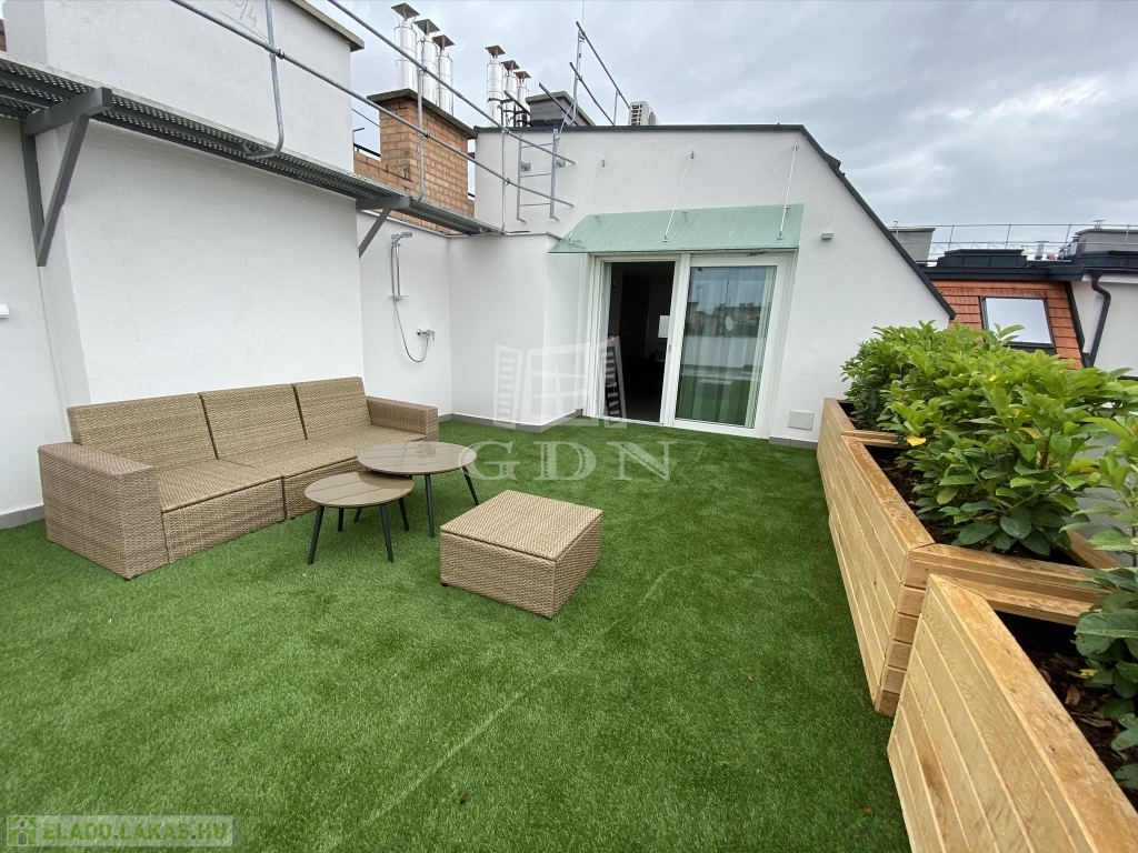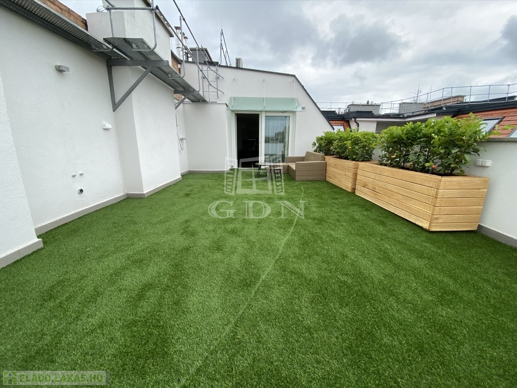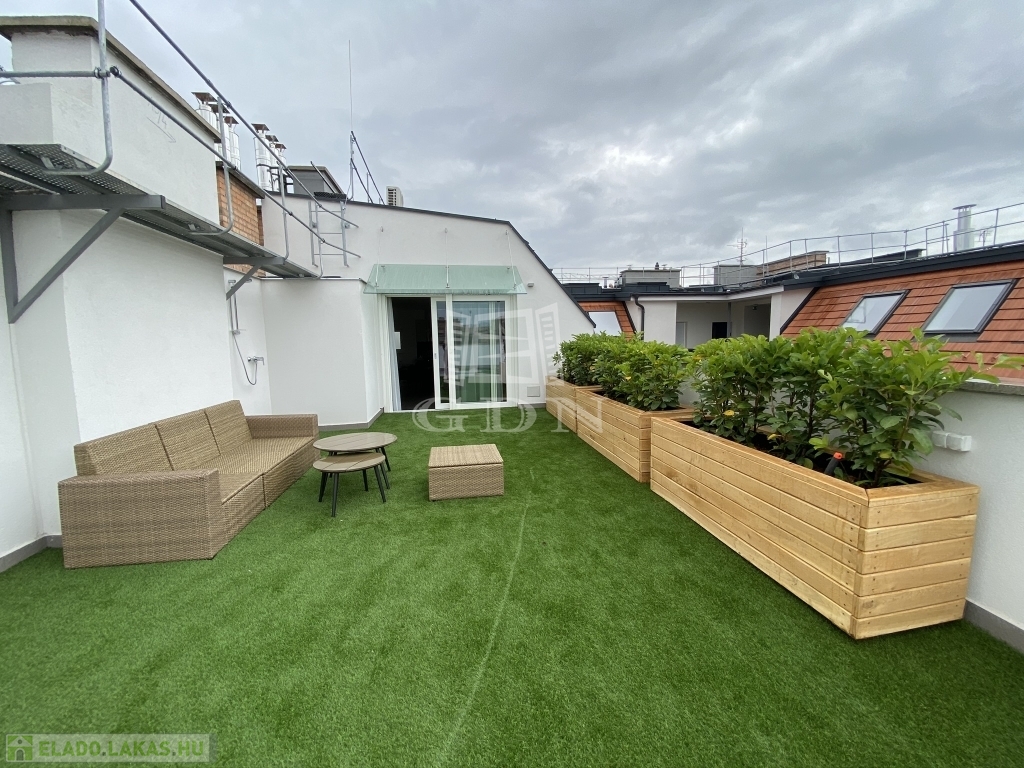 Nagymező utca közelében ajánljuk figyelmébe ezt az új építésű dupla komfortos, két hálószobás, nagy teraszos lakást. Az épület a beépítéssel párhuzamosan teljesen megújult, a lakás az ötödik emeleten található , a két hálószoba mellett két fürdőszoba került kialakításra. A lakás különlegessége a nappaliból nyíló 66m2-es terasz mely tavasztó őszig egy plusz szobát jelent. A lakás fűtése padlófűtés és gázkazán kombinációval lett megoldva mely a melegvizet is biztosítja.A hűtés split klímákkal megoldott, a konyha gépesített. A lakás jelenleg hosszú távra van bérbe adva 4,6% fizet évente a bérlő. Az elhelyezkedésének köszönhetően akár vagy rövidtávú bérbeadásra is tökéletes lehet.