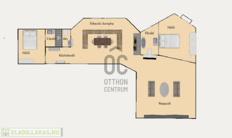 A remek elrendezésű lakás nagy nappalival , hatalmas étkezős konyhával és két fürdőszobakapcsolatos hálószobával rendelkezik.A vendégek számára külön mosdót alakítottak ki.